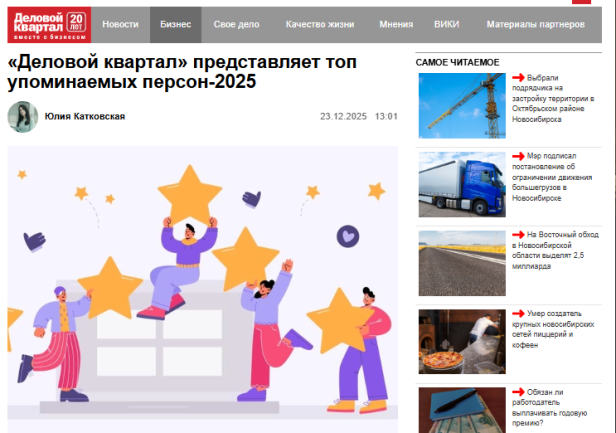 В рейтинг включают персон, упоминаемых в редакционных рубриках портала nsk.dk.ru в течение года не менее пяти раз. В категории «Бизнес» в тройку лидеров списка вошел генеральный директор ООО «Сибирское стекло» Антон Мор.