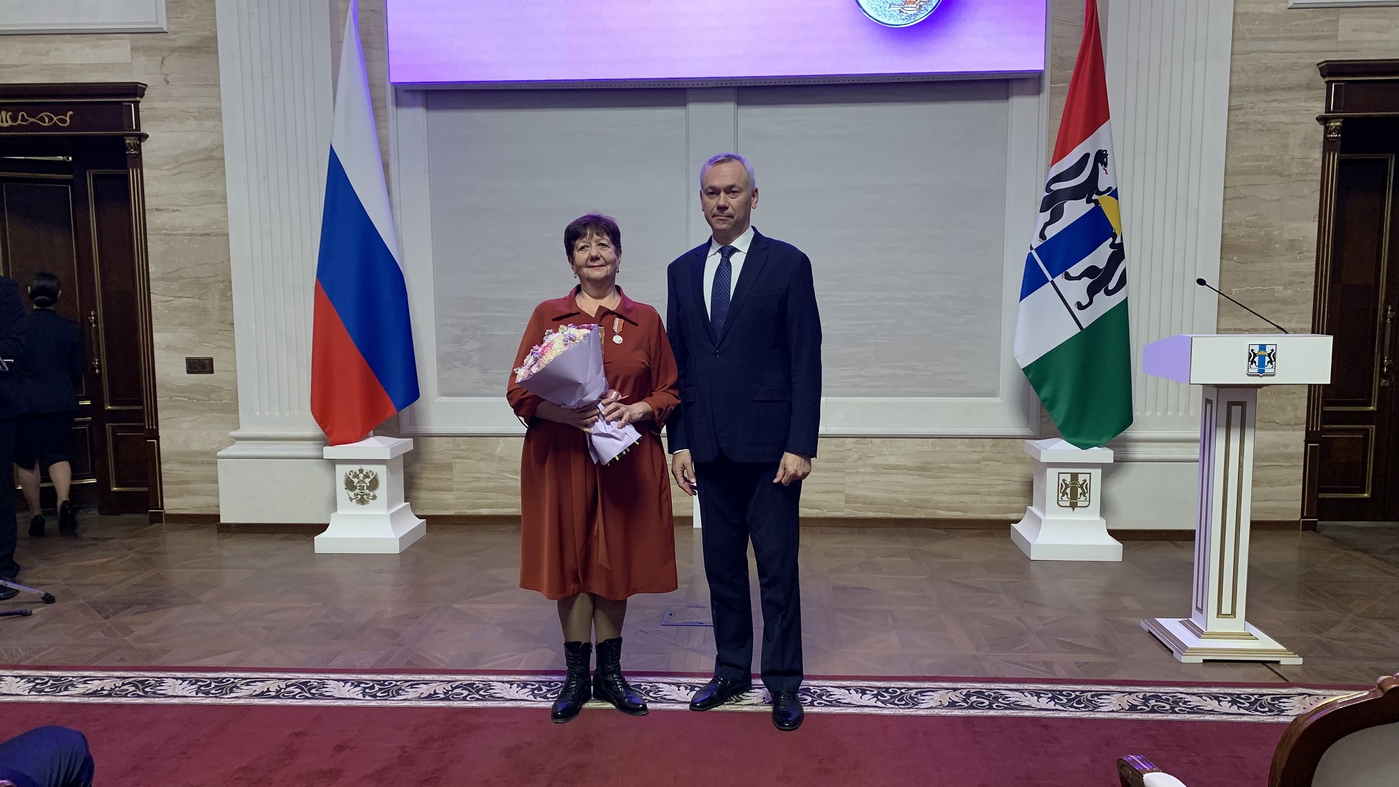 Знак отличия Ольге Александровне вручил губернатор Новосибирской области Андрей Травников – обладателей государственных и областных наград чествовали в региональном правительстве. – Это важное и торжественное событие для ваших коллег, родных и близких. Уверен, что ваш пример будет мотивировать и молодых специалистов, в том числе, будущих руководителей относиться к жизни и своему труду так же, как вы, – отметил Андрей Травников, который, поздравляя собравшихся, поблагодарил их за вклад в развитие региона и страны.
