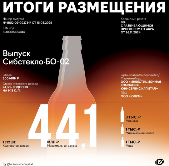 ООО «Сибирское стекло» («Сибстекло», один из лидирующих производителей стеклотары в России, актив РАТМ Холдинга) привлекло 300 млн рублей по итогам размещения на Московской бирже пятого выпуска облигаций серии Сибстекло-БО-02 (№ 4B02-02-00373-R от 15.08.2025).