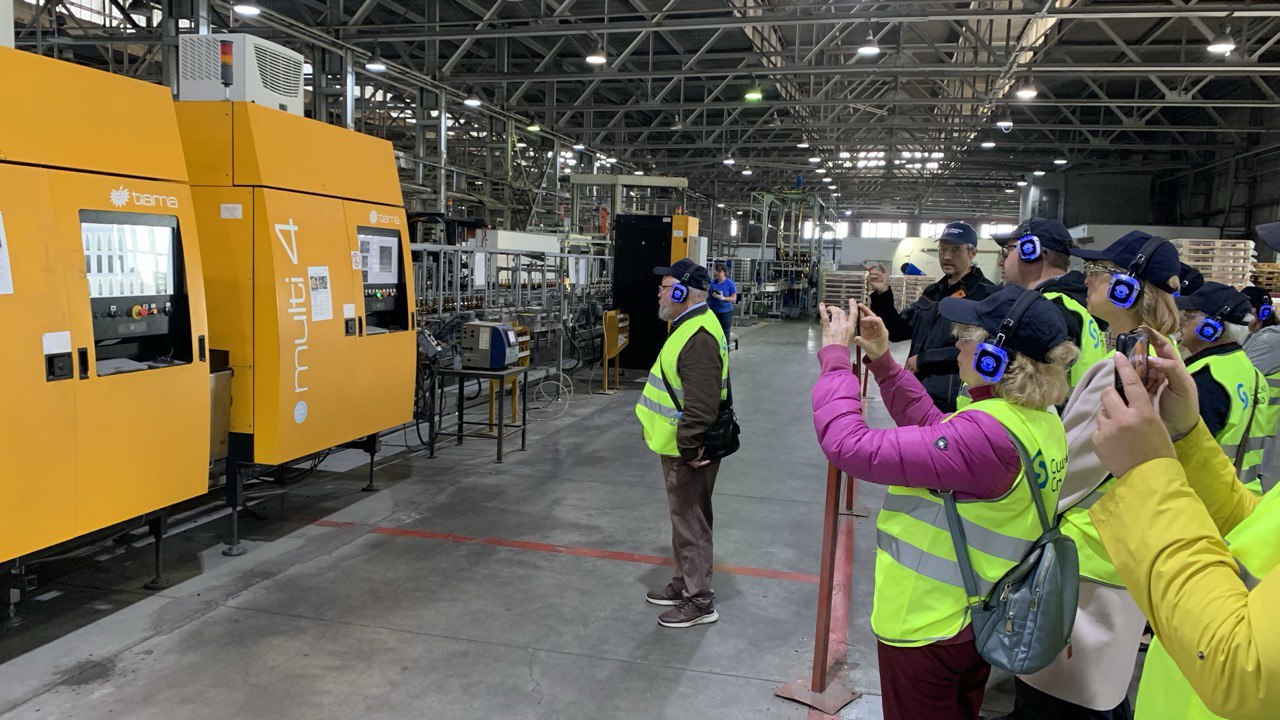 Гостям продемонстрировали все этапы изготовления тарного стекла: обработку стекольных отходов, загрузку вторичного сырья и шихты в стекловаренную печь, формование и отжиг стеклоизделий, контроль качества и упаковку готовой продукции. Участникам экскурсии рассказали о реализации «зеленой» повестки на предприятии – увеличении доли стеклобоя в составе компонентов для выпуска стеклотары, снижении веса стеклянной упаковки – расширении линейки сверхлегкой бутылки. Кроме того, речь шла о снабжении завода сырьем, импортозамещении оборудования и формировании кадрового резерва. «Предприятие развивается несмотря на санкции в отношении России. Из ответов на вопросы понятно, что сложности преодолимы. Впечатляют технологический уровень, условия труда. И, конечно, завораживает вид «горящего» стекла». «Компания движется по восходящей траектории: за десять лет сделаны огромные шаги вперед». «Чрезвычайно впечатляющая экскурсия – с глубоким погружением в тему, пониманием наших запросов. Нам уделили много внимания, привлекли высококлассных специалистов. Объективно существующие проблемы у вас находят решения, например, с поставками зарубежного оборудования. И ситуация с кадрами на вашем заводе лучше, чем на других». «Было очень интересно. Все подробно и ясно. Высокая культура производства, в цехах порядок». Такие отзывы звучали со стороны экскурсантов.
